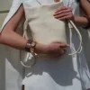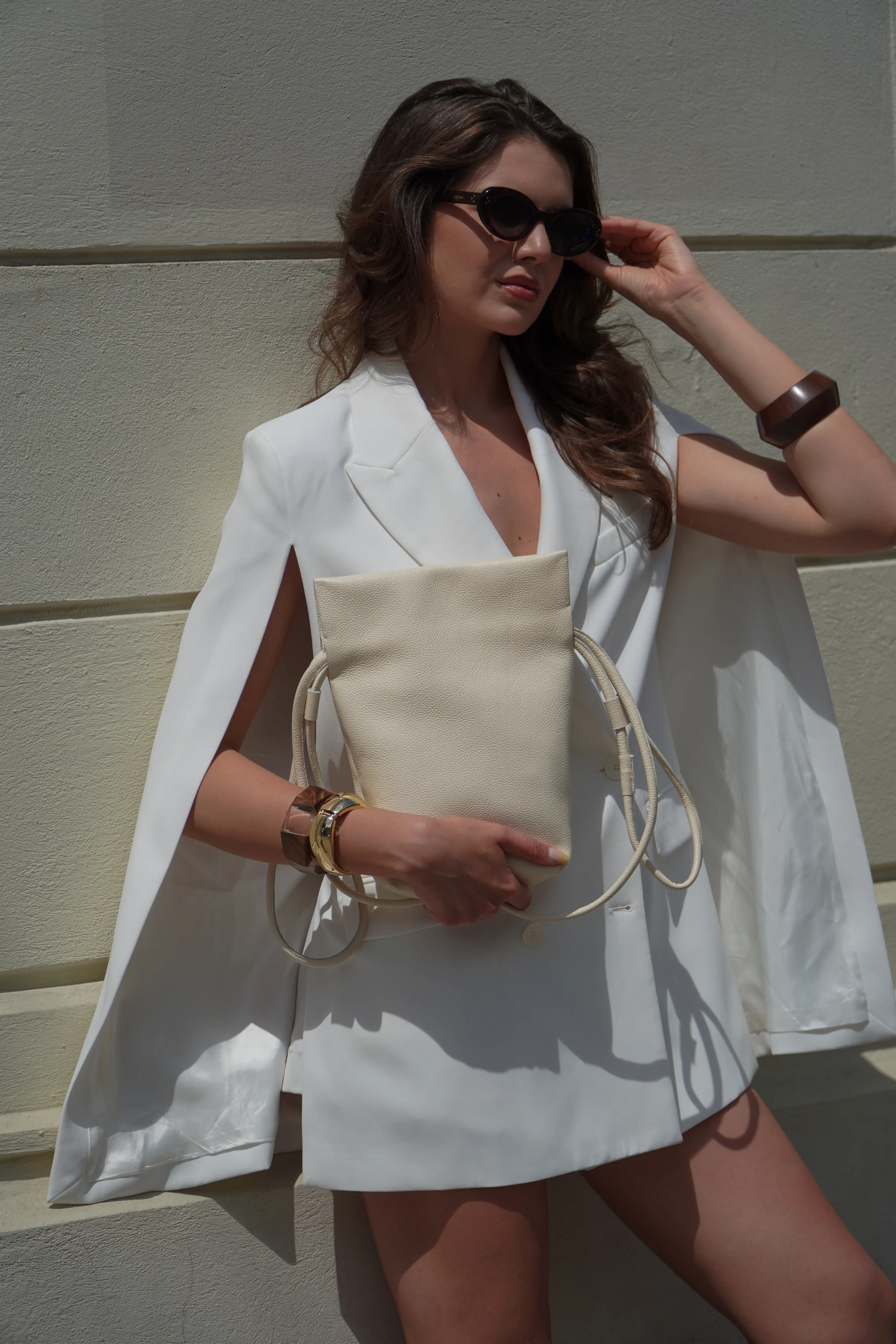 Sculpted in a clean, tapered silhouette from grained soft leather in a milky tone, this minimalist bag features an adjustable strap and a zippered inner pocket.